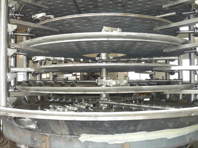 湿物料自加料器连续地加到干燥器上部第一层干燥盘上,带有耙叶的耙臂作回转运动使耙臂作回转运动使耙叶连续地翻抄物料。物料沿指数螺旋线流过干燥盘表面,在小干燥盘上的物料被移送到外缘,并在外缘落到下方的大干燥盘外缘,在大干盘上物料向里移动并从中间落料口落如下一层小干燥盘中。大小干燥盘上下交替排列,物料得以连续地流过整个干燥器。中空的干燥盘内通入加热介质,加热介质形式有饱和蒸汽、热水和导热油,加热介质由干燥盘的一端进入,从另一端导出。已干物料从最后一层干燥盘落到壳体的底层,最后被耙叶移送到出料口排出。湿份从物料中逸出,由设在顶盖上的排湿口排出,真空型盘式干燥器的湿气由设在顶盖上的真空泵口排出。从底层排出的干物料可直接包装。通过配加翅片加热器、溶剂回收冷凝器、袋式除尘器、干料返混机构、引风机等辅机,可提高其干燥的生产能力,干燥膏糊状和热敏性物 料,可方便地回收溶剂,并能进行热解和反应操作。