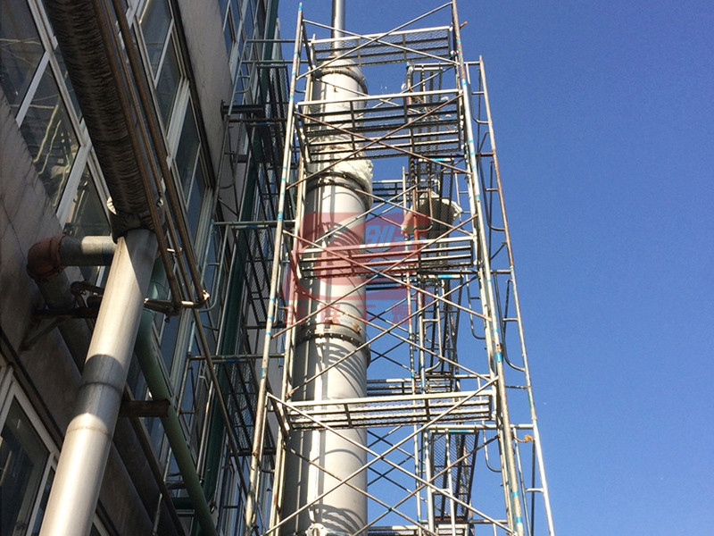 本装置采用高效的陶瓷制波纹填料。蒸馏塔体采用不锈钢制作,从而防止了铁屑堵塞填料的现象,延长了装置的使用期限。本装置中凡接触酒精的设备部份如冷凝器、稳压罐、冷却蛇管等均采用不锈钢,以确保成品酒精不被污染。W型之蒸馏釜采用可拆式U型加热管,在检修时可将U型加热管移出釜外,便于对加热管外壁及蒸馏釜内壁进行清洗。
