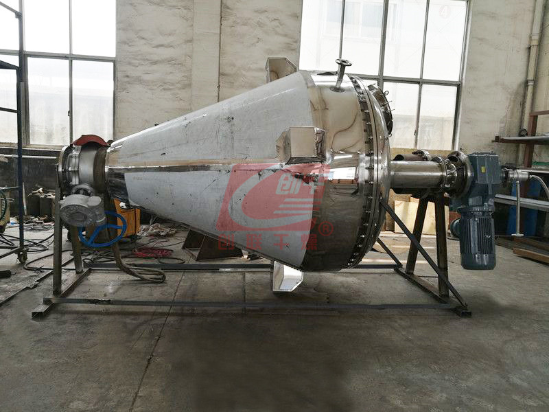三合一单锥螺带锥形真空干燥机是一种利用螺带将物料旋转提升及圆锥夹套、空心螺带内同时通入传热介质(如热水、导热油、蒸汽等),使加热后物料从四周提升并从中间下落,快速不断的循环翻转,并通过筒体内抽真空将水汽及时带走, 使物料在短时间内达到干燥和混合目的。与传统的立式混合机相比,筒体内无任何传动机构,从根本上杜绝因润滑油泄漏而导致物料污染,运行可靠稳定,特别适宜卫生要求高的粉料、颗粒混合;同时也适用于粘性流体或稠状、湿状为主物料的搅拌混合;与其它卧式干燥机相比,具有出料方便,可以100%完全出料,操作、维修方便。它的干燥效率是同等规格“双锥回转真空干燥机”3-5倍。